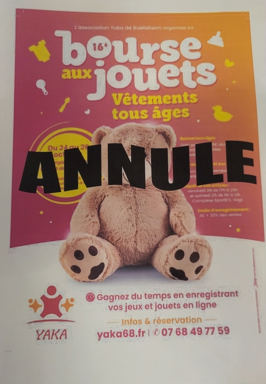 Nous sommes au regret de vous informer que la bourse aux vêtements et aux jouets est annulée, faute de bénévoles disponibles pour assurer l'organisation.